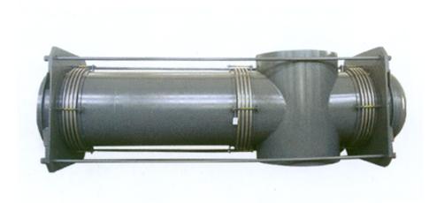 性能特點:該膨脹節(jié)的前部(輸流端)有兩個工作波紋管,后部(盲端)有一個平衡波紋管構(gòu)成。工作波紋管吸收來自彎管段產(chǎn)生的橫向位移;平衡波紋管吸收來自直管段的軸向位移。
