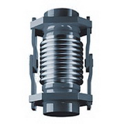 單式鉸鏈型波紋膨脹節(jié)通過(guò)其角度的變化來(lái)吸收管線、輸送通道或容器等沿其軸向方向因熱膨脹或收縮所引起的角向位移。通常兩件或三件組合使用,補(bǔ)償量與兩件產(chǎn)品間距離成正比,其優(yōu)點(diǎn)是體積小,重量輕,產(chǎn)品壓力推力由鉸鏈構(gòu)件承受, 角向鉸鏈波紋補(bǔ)償器可以補(bǔ)償管線在任意方向的角位移。